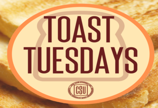Background picture of a slice of toast with the text "toast tuesdays" in an orange circle.