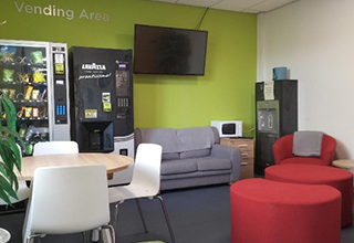 Room with 2 vending machines, a table, chairs and sofa.