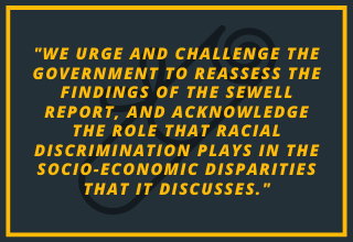 As an organisation, we echo the voice of our students and both urge and challenge the Government to reassess the findings of the Sewell report and acknowledge the role that racial discrimination plays in the socio-economic disparities that it discusses.